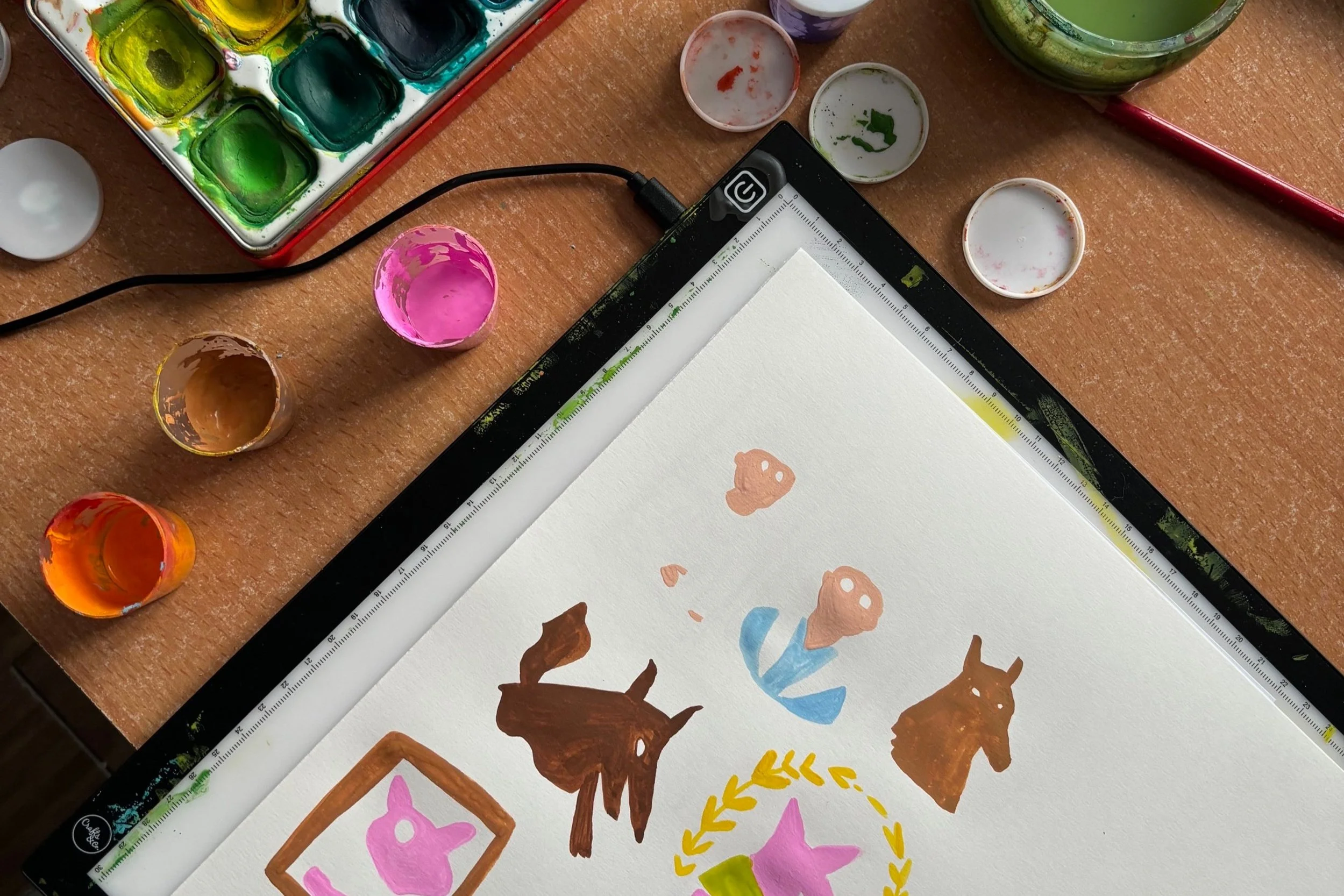 The text under the objects is handwritten and the illustrations are all in gouache and colored pencil.